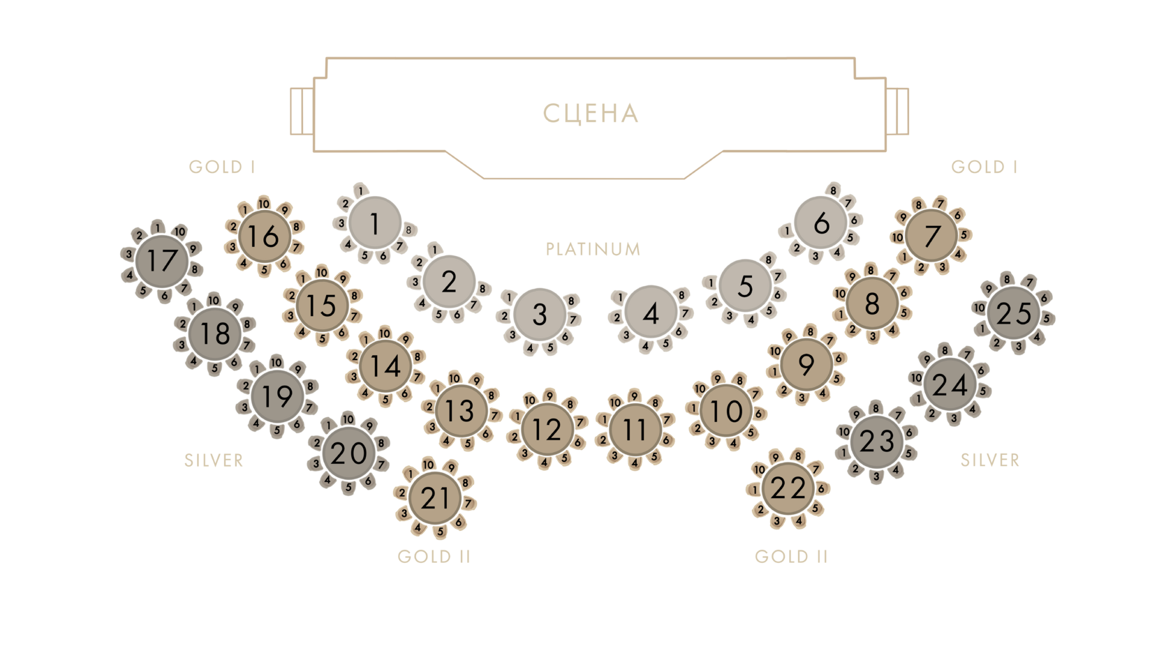 Праздничный гала-ужин, включая алкогольные и безалкогольные напитки категории Премиум; Праздничный гала-ужин, включая алкогольные и безалкогольные напитки категории VIP; Праздничный гала-ужин, включая алкогольные и безалкогольные напитки; Сектор PLATINUM не предусматривает детский тариф.